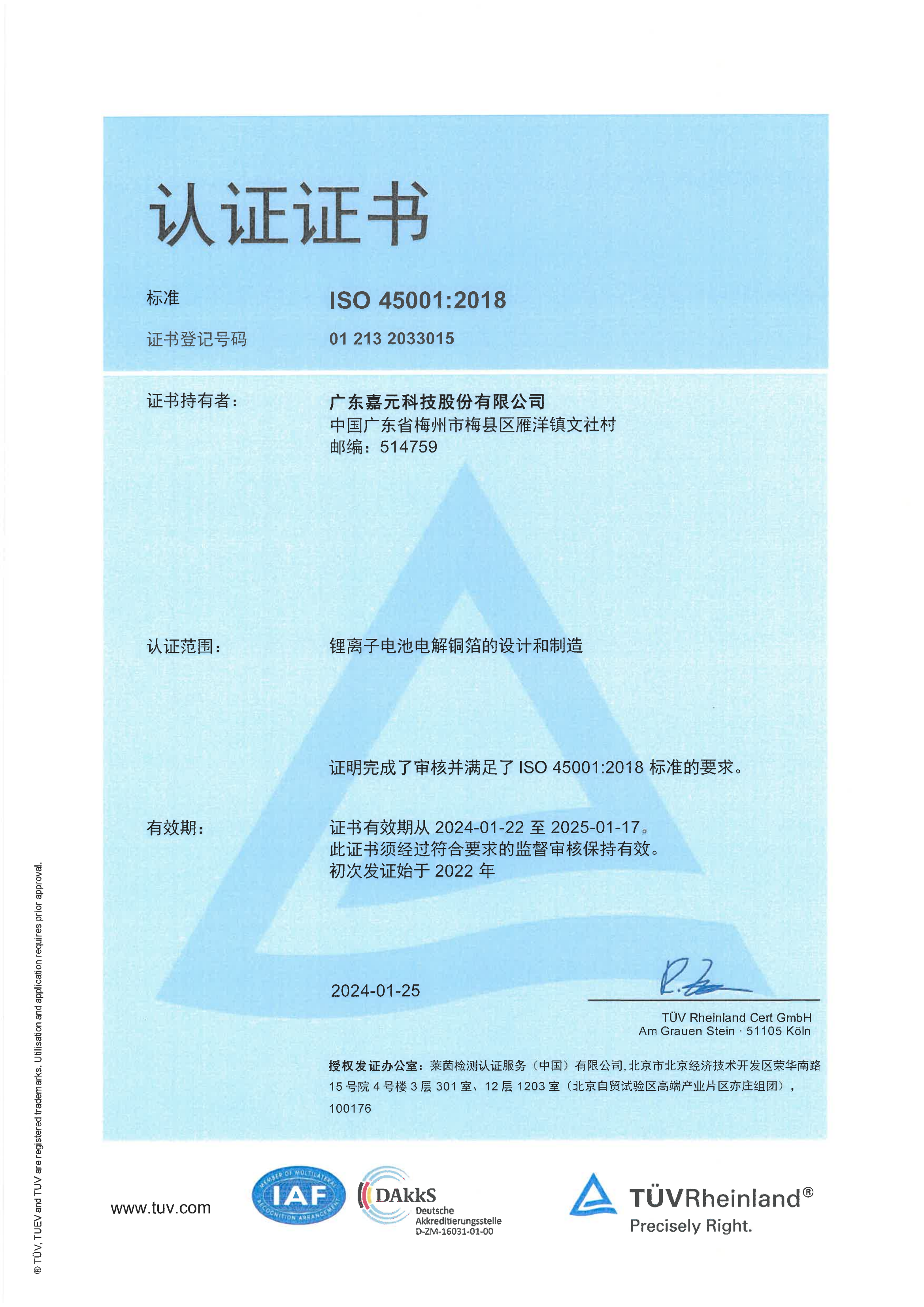 ISO 45001:2018认证证书